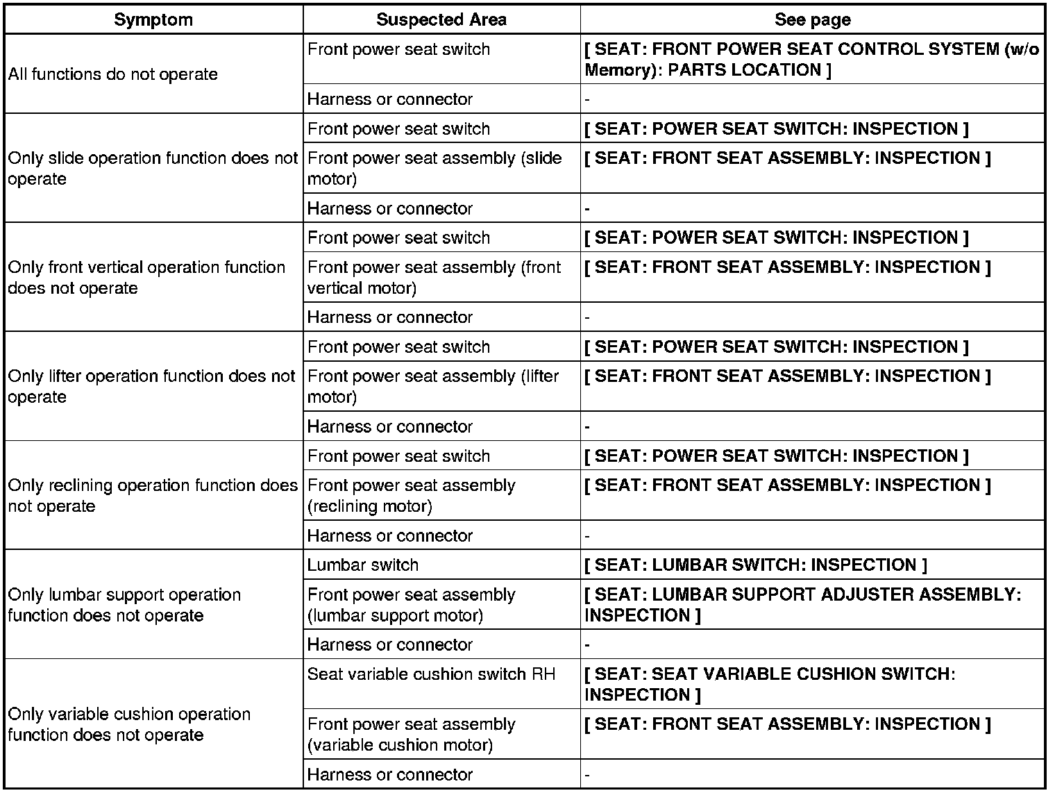 SEAT: FRONT POWER SEAT CONTROL SYSTEM (w/o Memory): PROBLEM SYMPTOMS TABLE