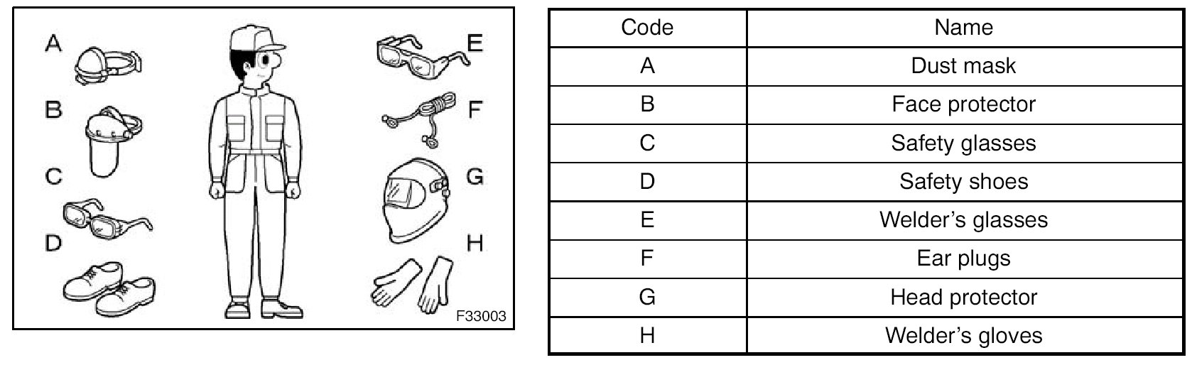 1. In addition to the usual mechanic's wear, cap and safety shoes, the appropriate gloves, head protector, welder's glasses, ear plugs, face protector, dust mask, etc. should be worn as the situation demands.