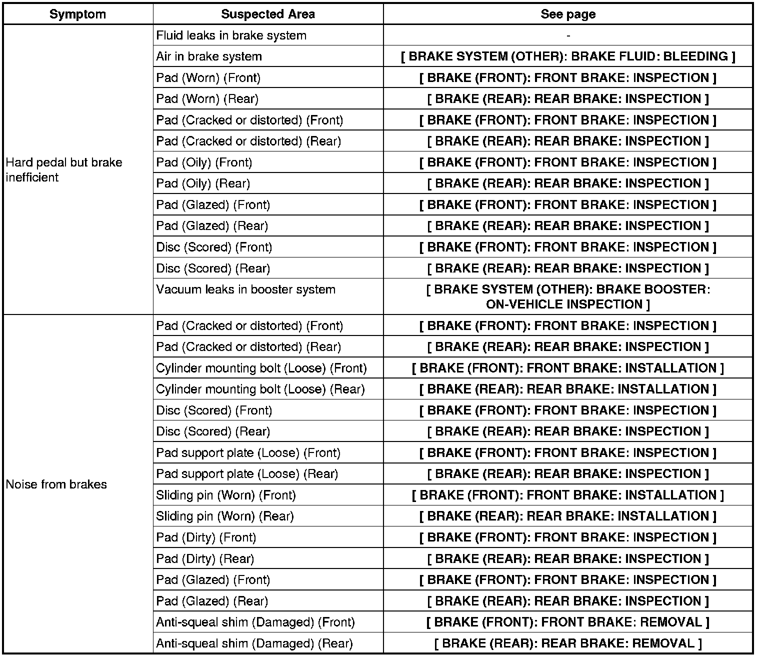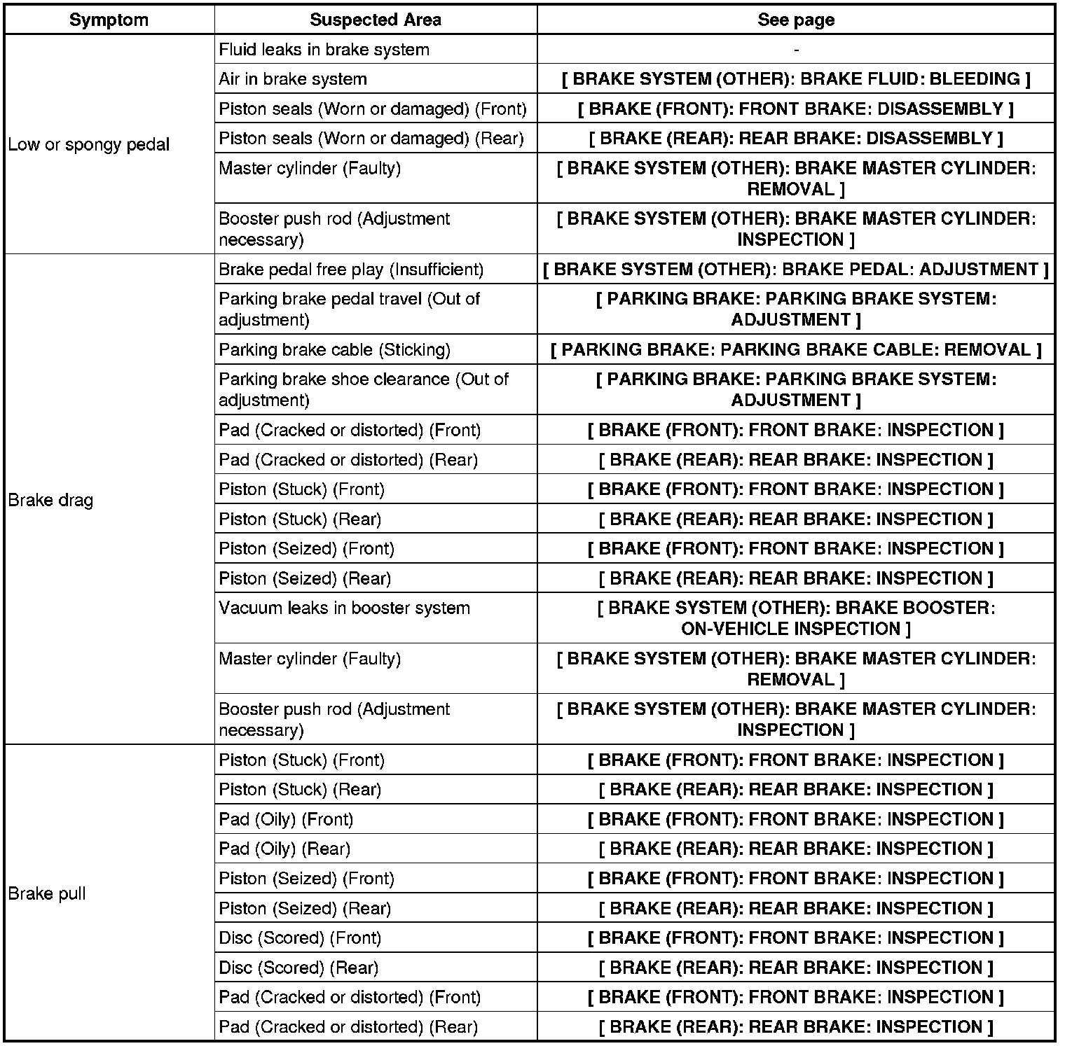 BRAKE SYSTEM (OTHER): BRAKE SYSTEM: PROBLEM SYMPTOMS TABLE