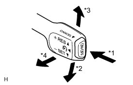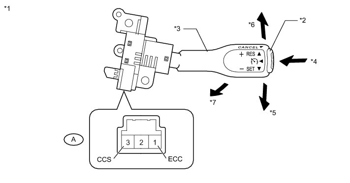 The cruise control main switch operates 7 functions: SET, - (COAST), TAP-DOWN, RES (RESUME), + (ACCEL), TAP-UP, and CANCEL. The SET, TAP-DOWN, and - (COAST) functions, and the RES (RESUME), TAP-UP, and + (ACCEL) functions are operated with the same switch. The cruise control main switch is an automatic return type switch which turns on only while operating it in the direction of each arrow and turns off after releasing it. The internal contact point of the cruise control main switch is turned on with the switch operation. Then the ECM reads the voltage value that has been changed by the switch operation to control SET, - (COAST), RES (RESUME), + (ACCEL), and CANCEL.
