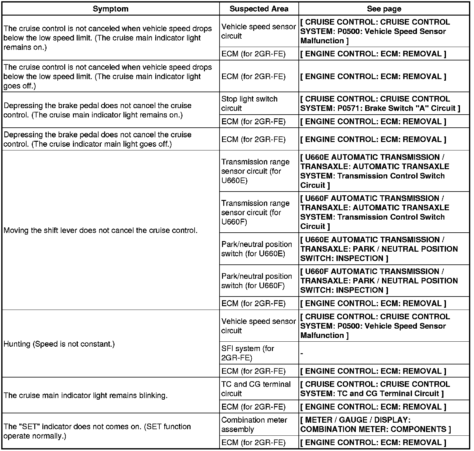 CRUISE CONTROL: CRUISE CONTROL SYSTEM: PROBLEM SYMPTOMS TABLE