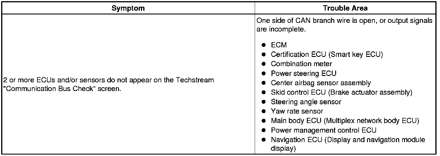 If some ECUs and sensors repeatedly appear and disappear from the "CAN Bus Check" screen, communication between the normal ECUs (sensors) and the Techstream may be affected by the incomplete signals that are output from the ECU that has an open circuit in either of its CAN branch wires. In this case, the CAN branch wires for the ECUs and sensors that repeatedly appear and disappear from the screen are normal and the ECU that is not displayed on the screen may be the main cause of the problem (this ECU may have an open circuit in either of its CAN branch wires).