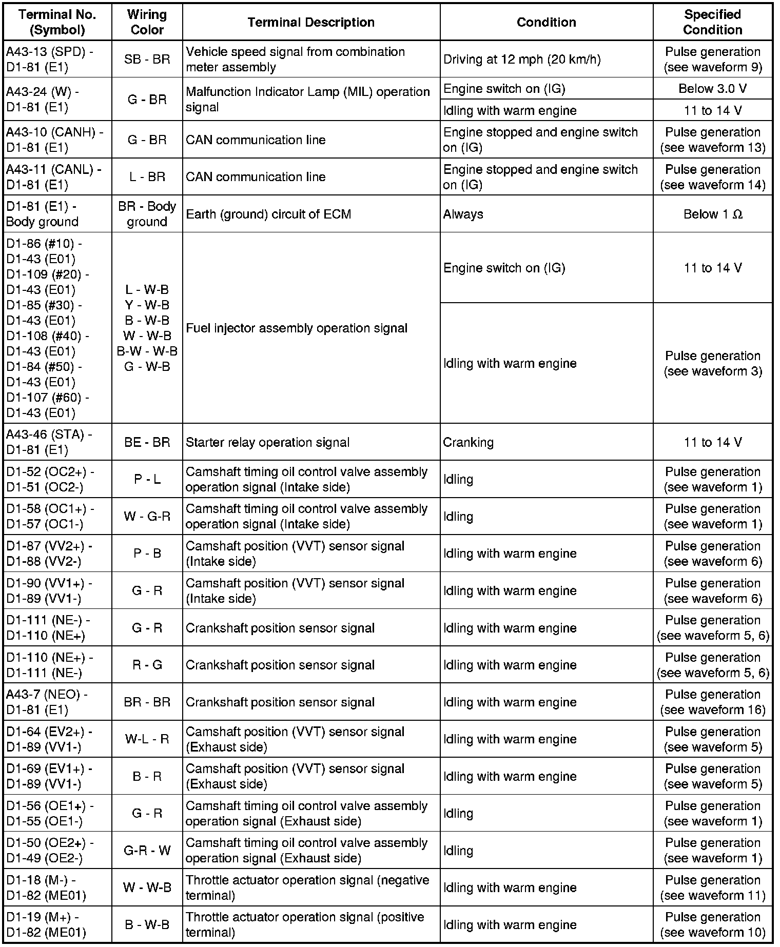 The standard normal voltage between each pair of the ECM terminals is shown in the table below. The appropriate conditions for checking each pair of the terminals are also indicated.