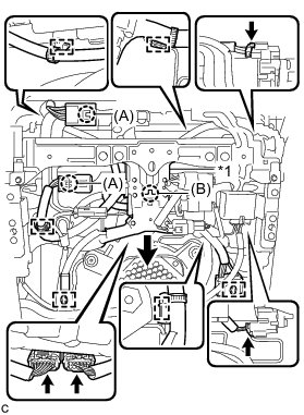 (b) Disengage the 2 claws (A) and separate the 2 connectors.
