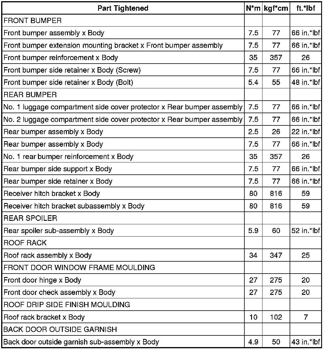 SPECIFICATIONS: EXTERIOR PANELS / TRIM: TORQUE SPECIFICATIONS