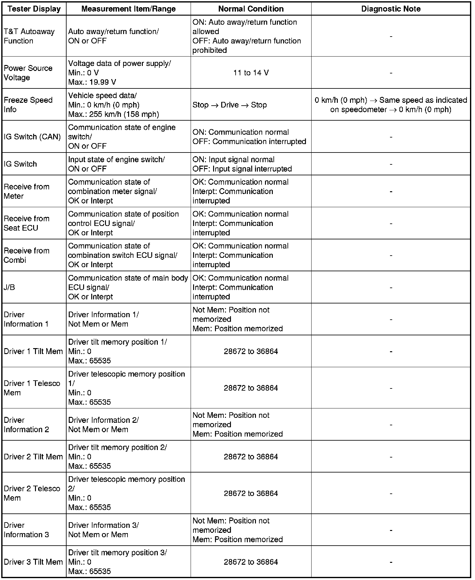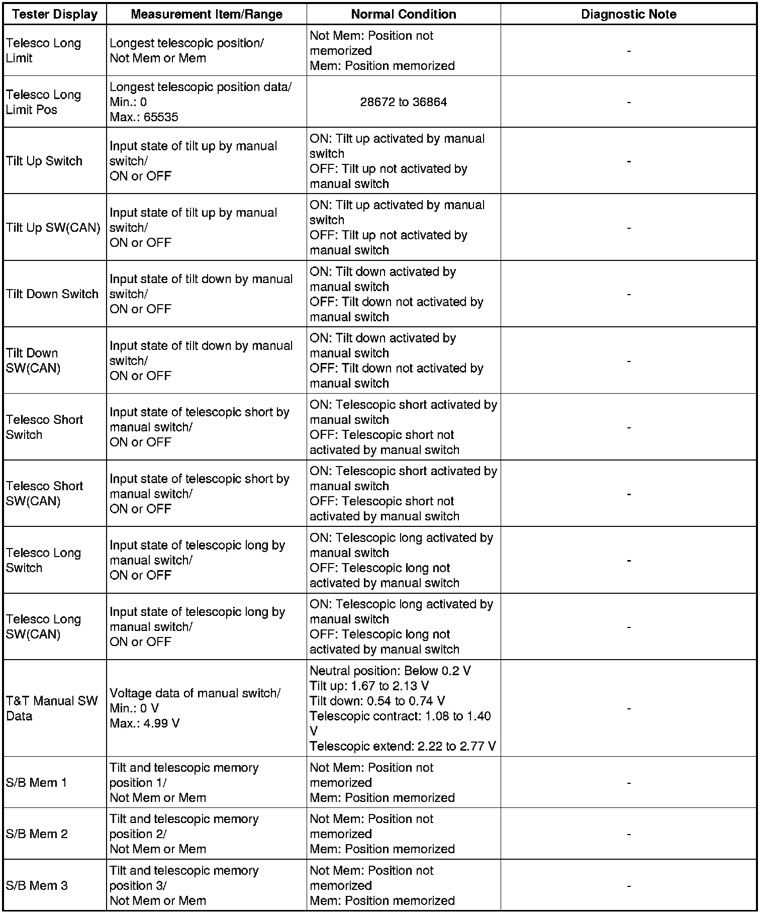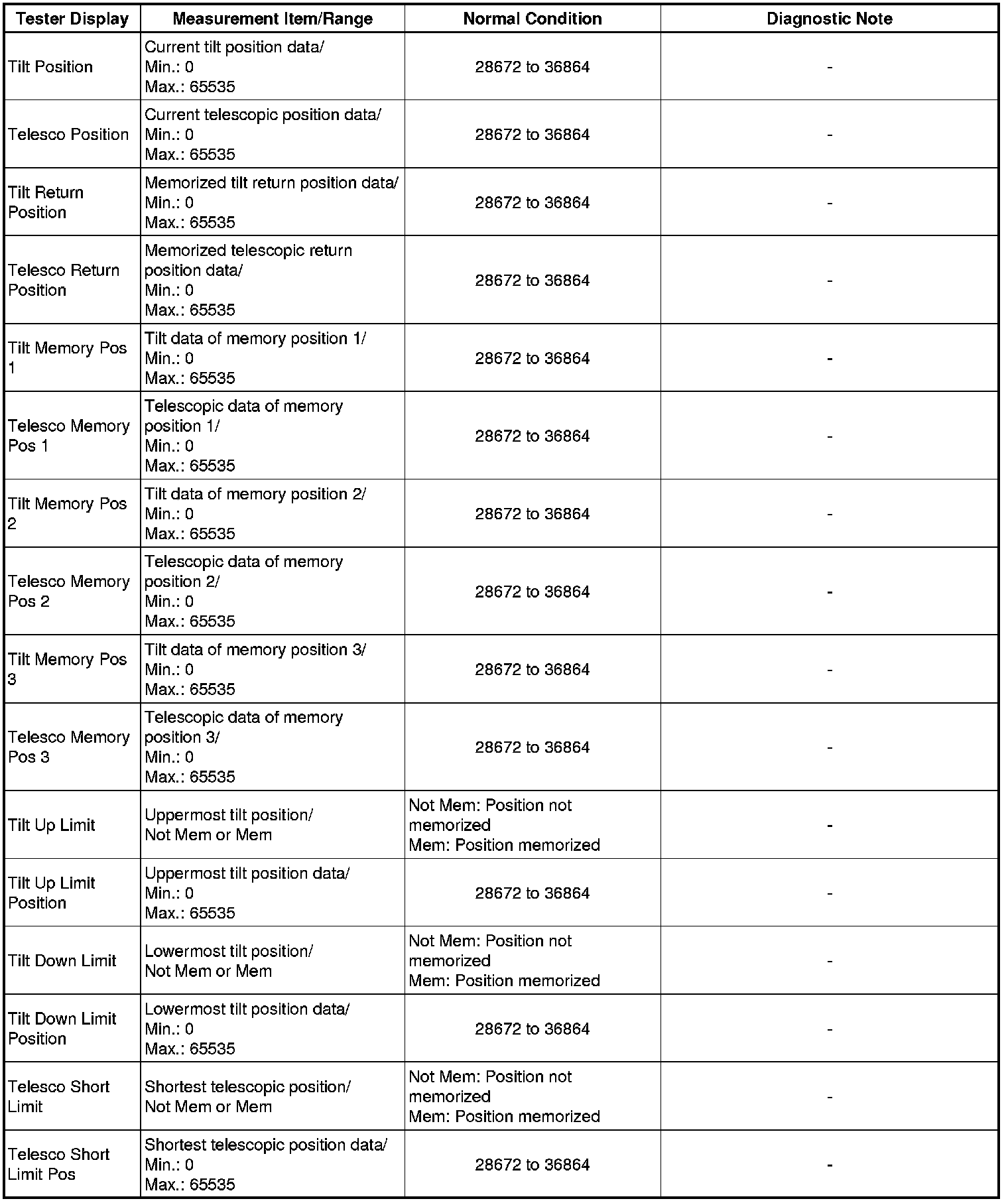 (e) Enter the following menus: Body Electrical / Tilt & Telescopic / Data List.