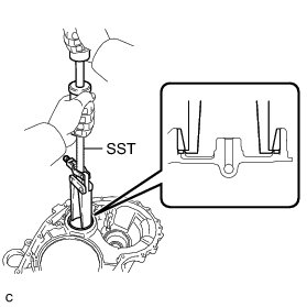 (a) Using SST, remove the counter driven gear front tapered roller bearing outer race and shim from the transaxle housing.