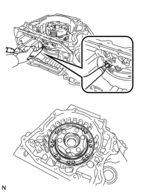 (a) Apply compressed air (392 kPa, 4.0 kgf/cm2, 57 psi) to the ATF hole to remove the No. 2 brake piston from the transaxle case.