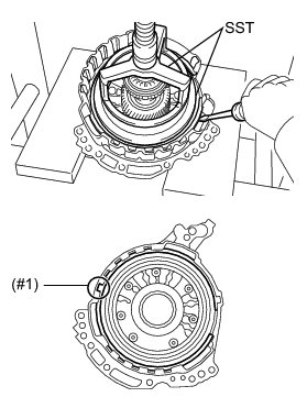 * Make sure to align the protruding part of the snap ring with the indented part (#1) of the front oil pump assembly shown in the illustration to install the snap ring.