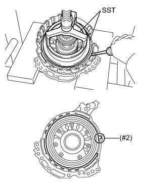 * Make sure to align the protruding part of the snap ring with the indented part (#2) of the front oil pump assembly shown in the illustration to install the snap ring.