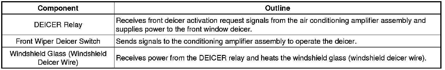 The windshield deicer system thin heater wires are attached to the inside of the front window and deice the window surface quickly. The indicator light illuminates while the system is operating. The system automatically turns off after approximately 15 minutes.