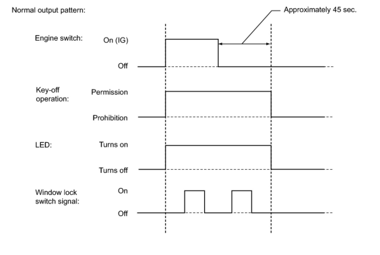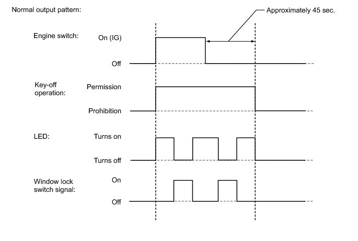 During normal operation (fail-safe is not operating), or during fail-safe mode when there is a pulse sensor malfunction or the window position or learned value is abnormal, the LED illuminates as shown in the illustration.