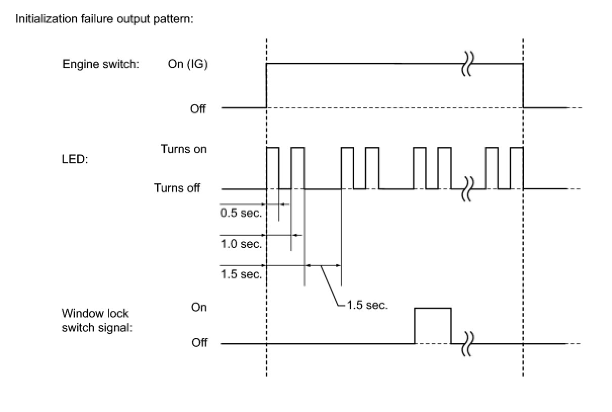 During initialization of the power window regulator motor ECU, when the window position or initialization complete status cannot be properly read from the EEPROM, the power window control system prohibits the operations as follows: