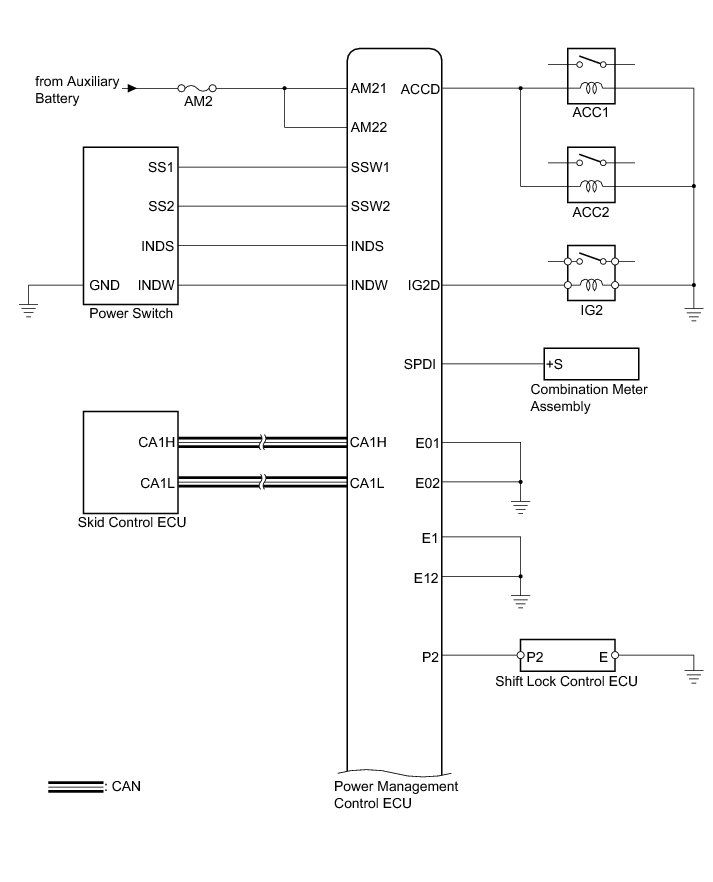 The power management control ECU consists of the IG1 NO. 4, IG1 NO. 1, IG1 NO. 2, IG1 NO. 3, IG2, ACC1, ACC2 relay actuation circuits and CPU.