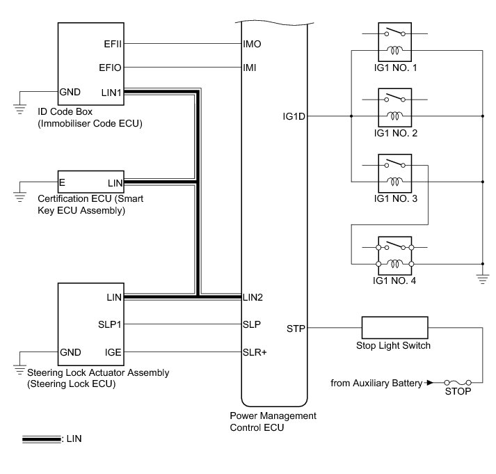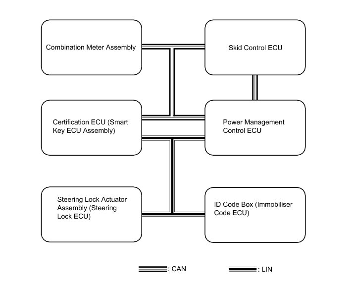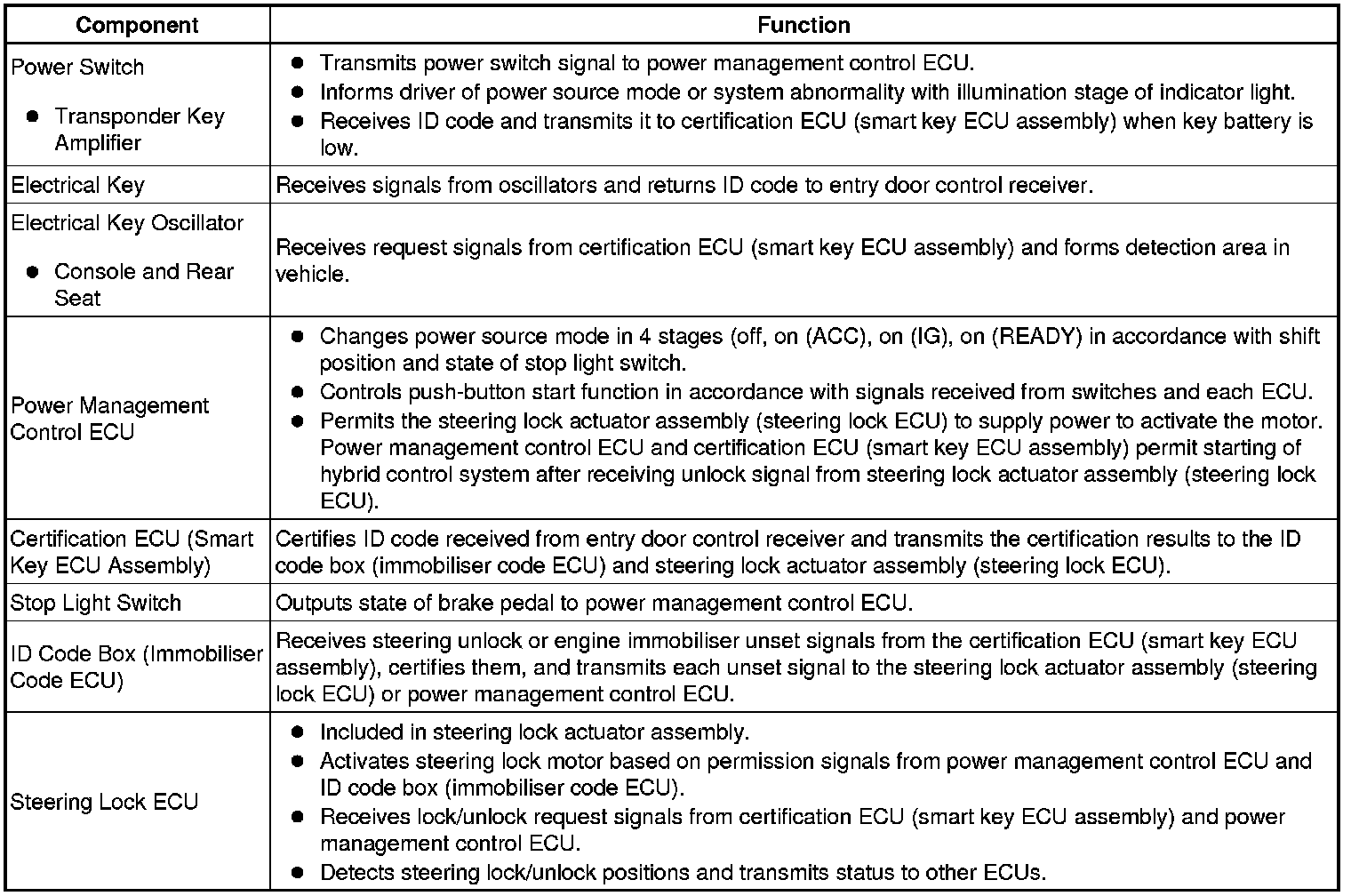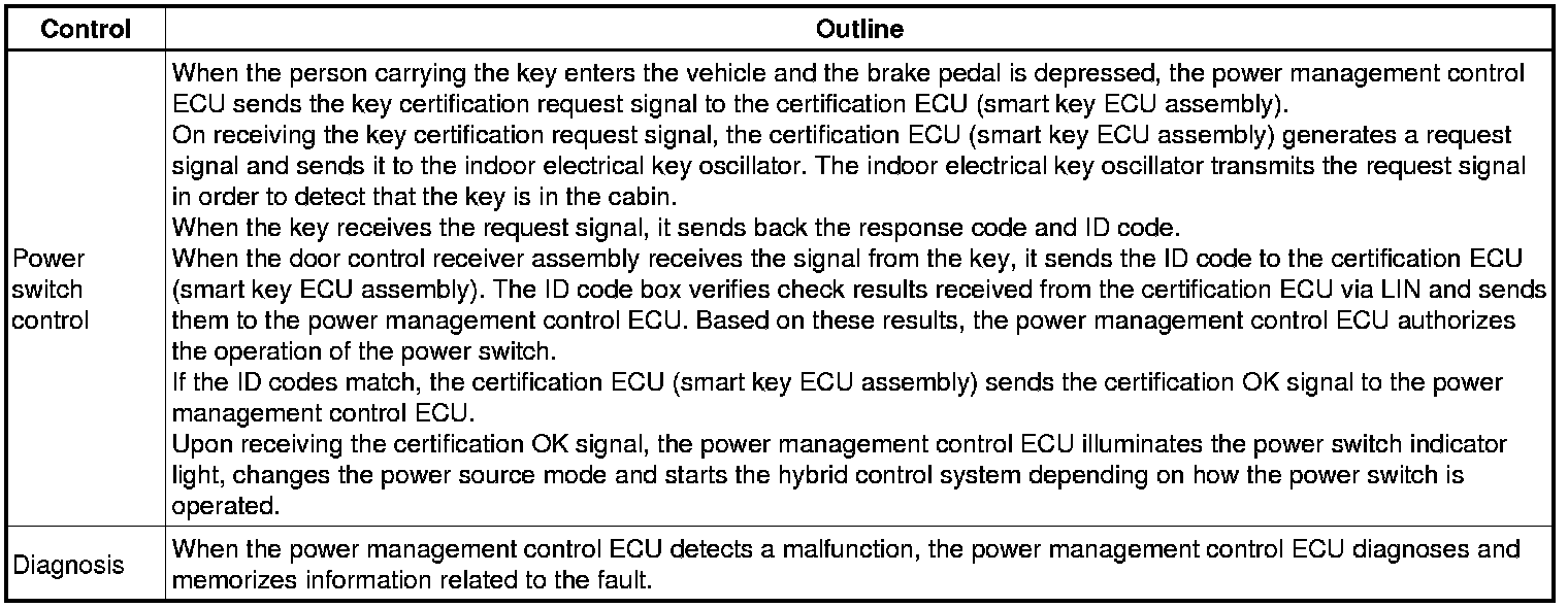 (a) The push-button start uses a push-type power switch, which the driver can operate by merely carrying the electrical key. This system consists primarily of the power management control ECU, power switch, steering lock actuator assembly (steering lock ECU), electrical key, ACC1 relay, ACC2 relay, IG1 NO. 4 relay, IG1 NO. 1 relay, IG1 NO. 2 relay, IG1 NO. 3 relay, IG2 relay ID code box (immobilizer code ECU) and certification ECU (smart key ECU assembly). The power management control ECU controls the system. This function operates in cooperation with the smart access system with push-button start.