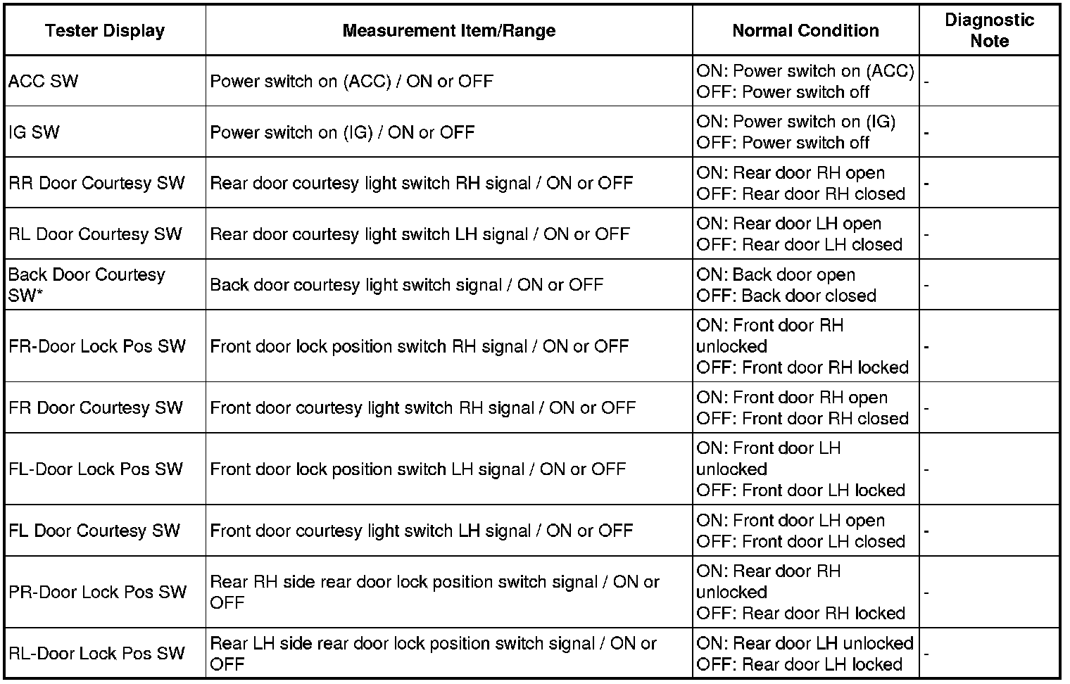 Using the Techstream to read the Data List allows the values or states of switches, sensors, actuators and other items to be read without removing any parts. This non-intrusive inspection can be very useful because intermittent conditions or signals may be discovered before parts or wiring is disturbed. Reading the Data List information early in troubleshooting is one way to save diagnostic time.