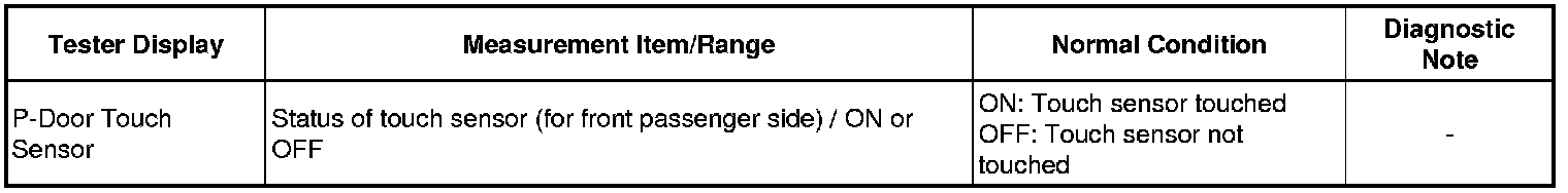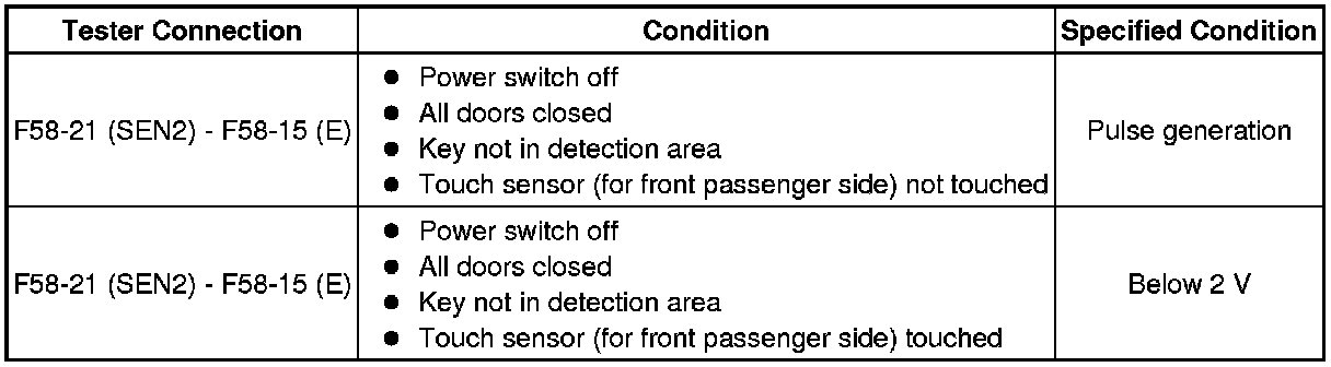 If the front passenger door entry lock function operates normally, but its entry unlock function does not, this means that the request code from the front passenger door is being output normally. In this case, a malfunction in the touch sensor circuit (from the certification ECU (smart key ECU assembly) to the front door outside handle assembly (touch sensor)) is suspected.