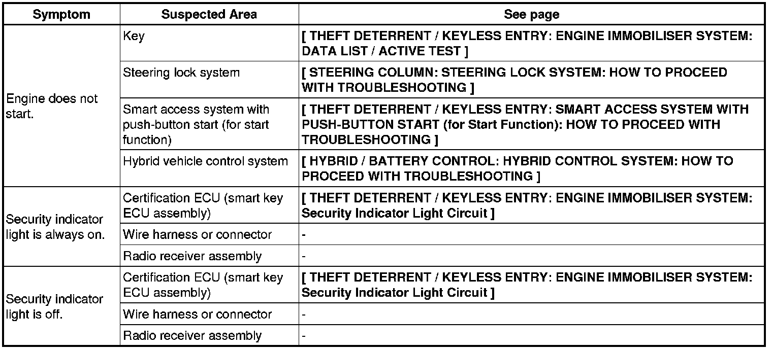 THEFT DETERRENT / KEYLESS ENTRY: ENGINE IMMOBILIZER SYSTEM: PROBLEM SYMPTOMS TABLE
