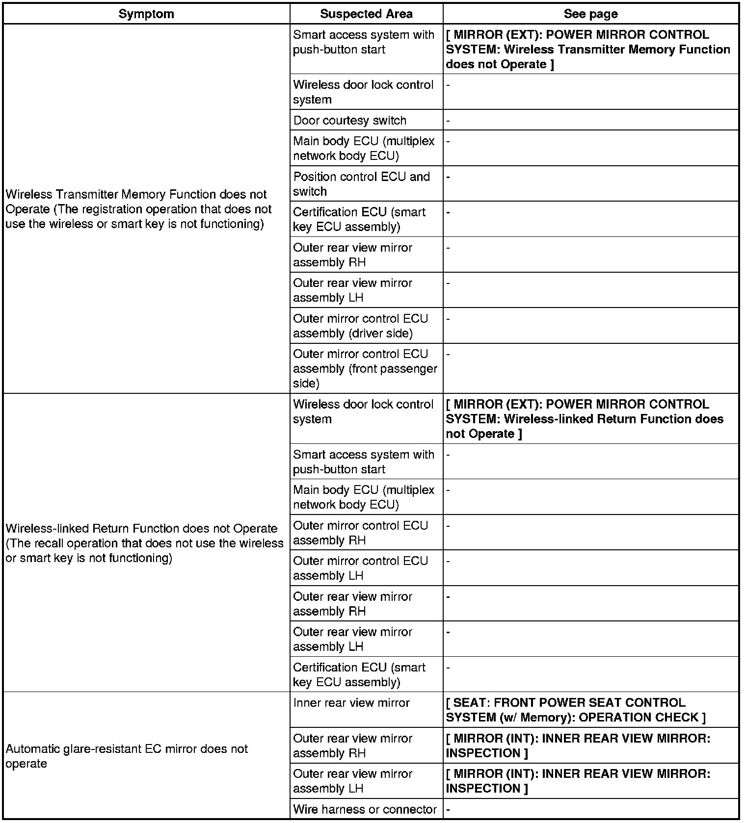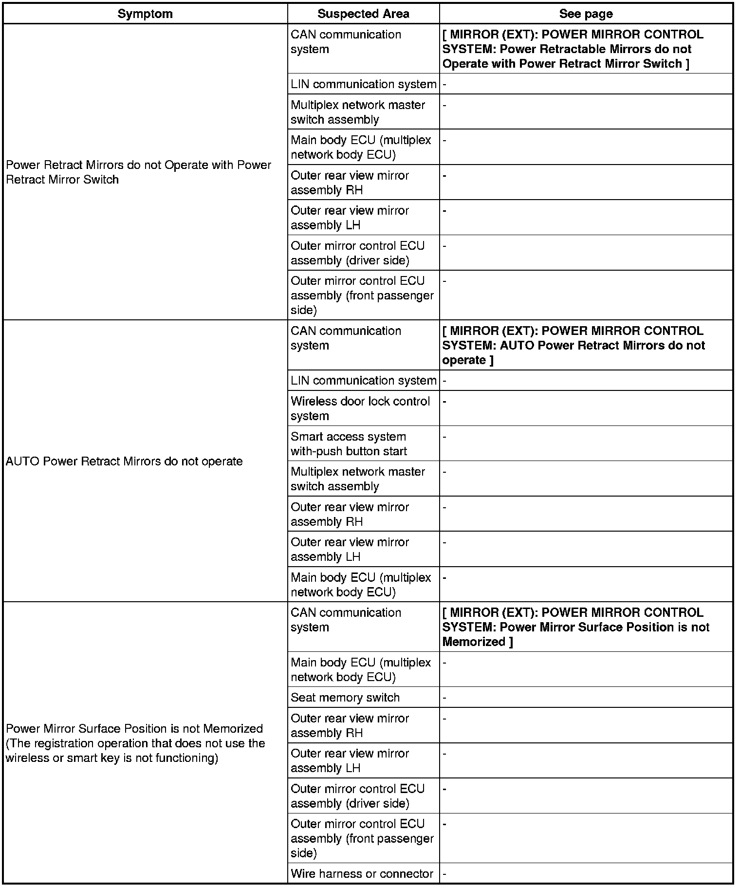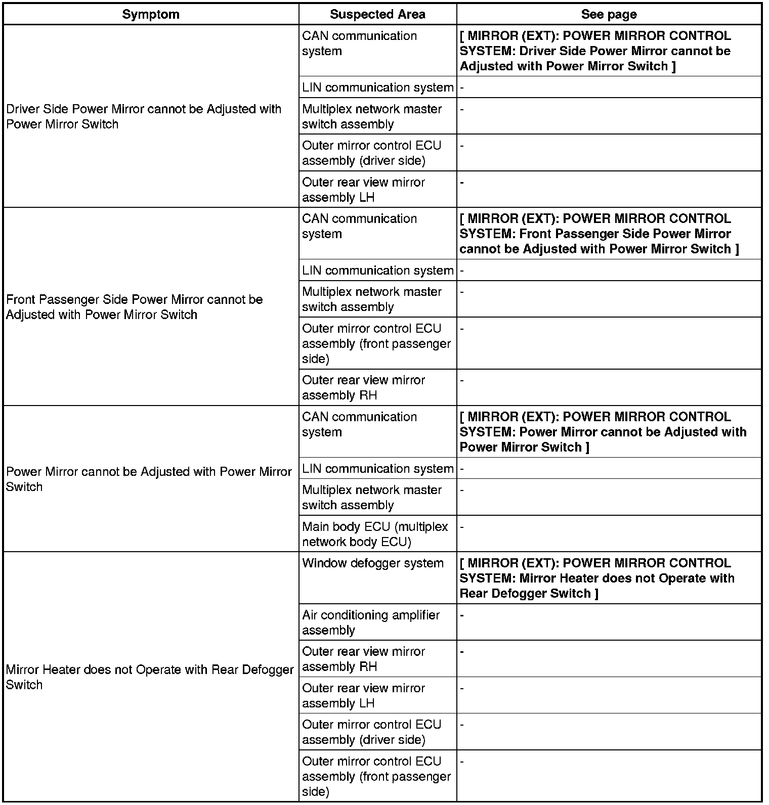 MIRROR (EXT): POWER MIRROR CONTROL SYSTEM: PROBLEM SYMPTOMS TABLE
