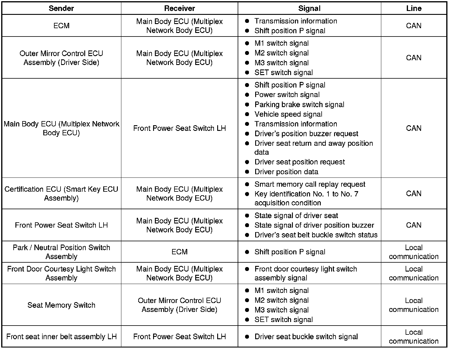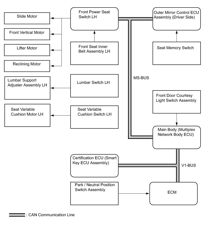 The seat memory switch sends memory switch information to the outer mirror control ECU assembly (driver side). Then the information is sent to the main body ECU (multiplex network body ECU) via CAN. The information is received by the main body ECU (multiplex network body ECU) and an instruction to memorize the seat position is sent to the front power seat switch LH via CAN. As a result, the seat position is memorized.