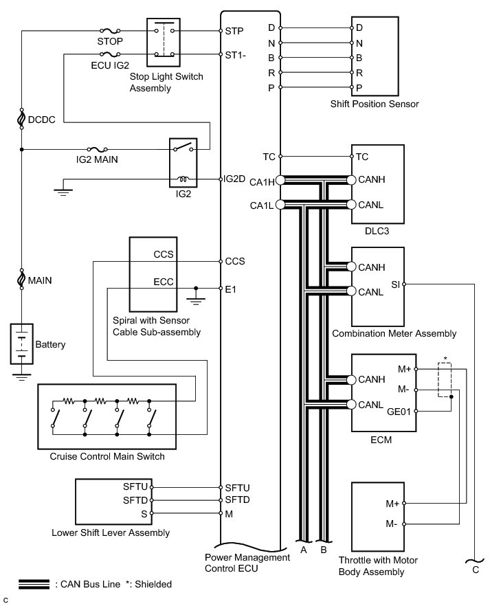 The power management control ECU cancels cruise control operation when the shift lever is moved from D to N or 3rd, 2nd, or 1st range is selected with the shift lever in S, and the power management control ECU receives a shift position sensor signal.