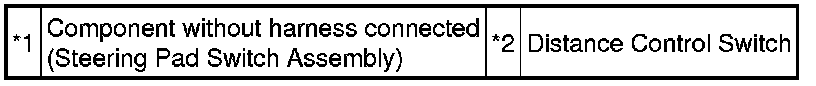 The distance control switch sets vehicle-to-vehicle distance control mode distance. The distance control switch is installed in the steering pad switch assembly. The vehicle-to-vehicle distance set value can be changed by operating the steering pad switch assembly (distance control switch) while the dynamic radar cruise control system is operating.