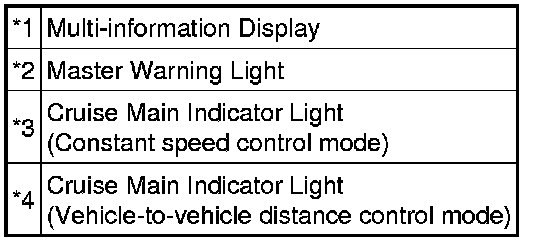 (a) The diagnosis function makes the master warning light and the multi-information display come on, and the cruise main indicator light blinks as shown in the illustration. When a malfunction occurs in the dynamic radar cruise control system, the DTCs are stored in the driving support ECU.