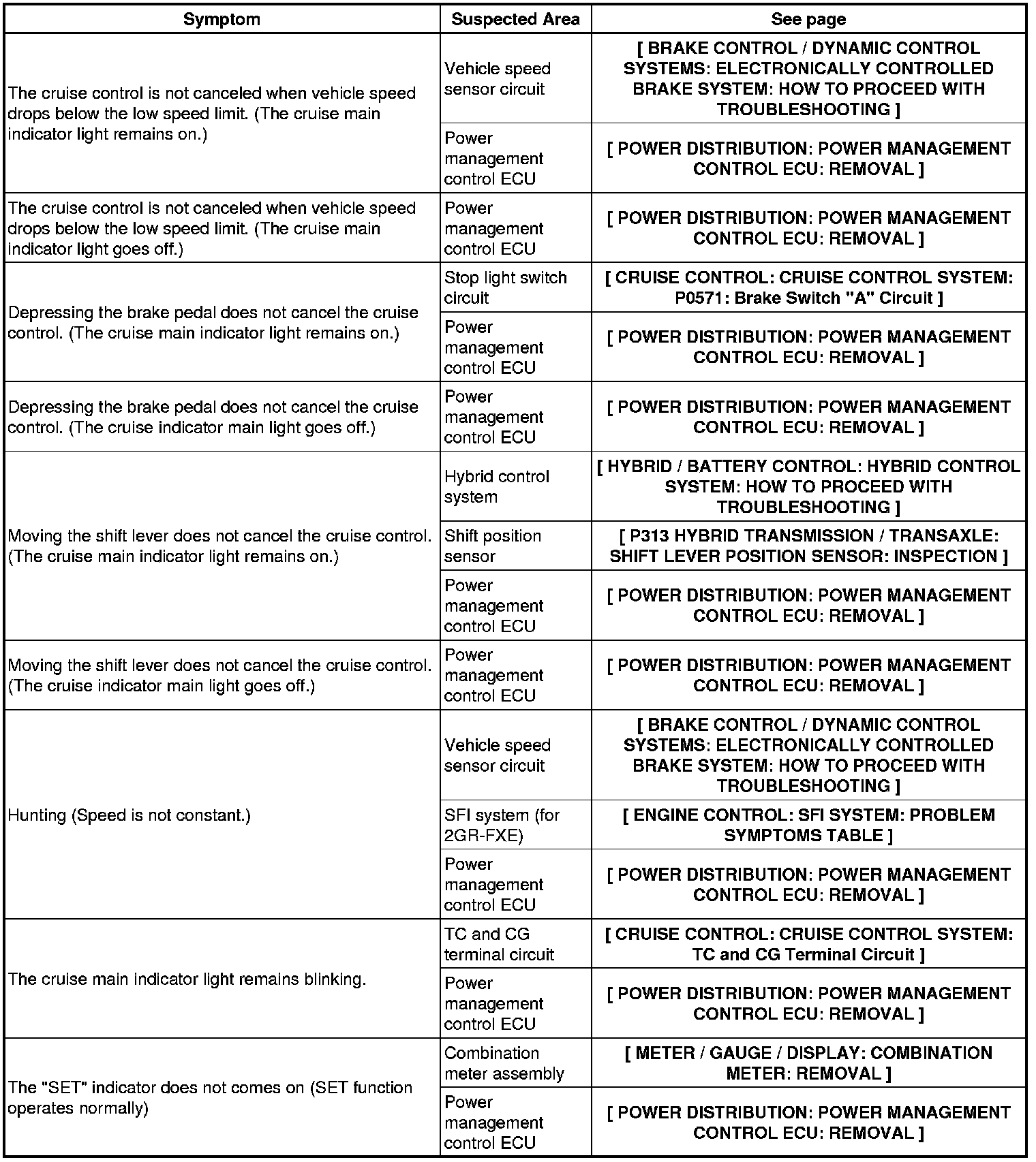 CRUISE CONTROL: CRUISE CONTROL SYSTEM: PROBLEM SYMPTOMS TABLE