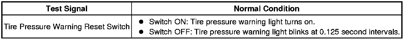 Every time the test mode DTC erasure conditions are satisfied, the tire pressure warning light turns on for 1 second. Then, the tire pressure warning light blinks at 0.125 second intervals.