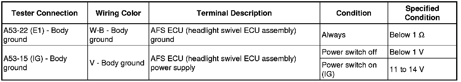 If the result is not as specified, the AFS ECU (headlight swivel ECU assembly) may be malfunctioning.