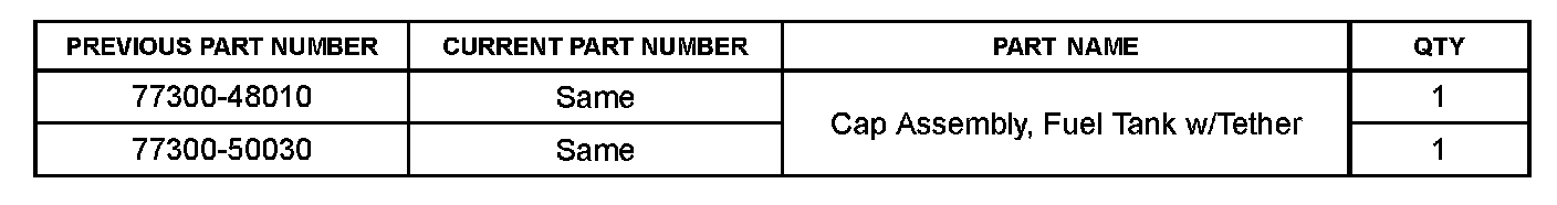 ^ YES - Replace fuel cap with part number 77300-50030 and go to step 5.