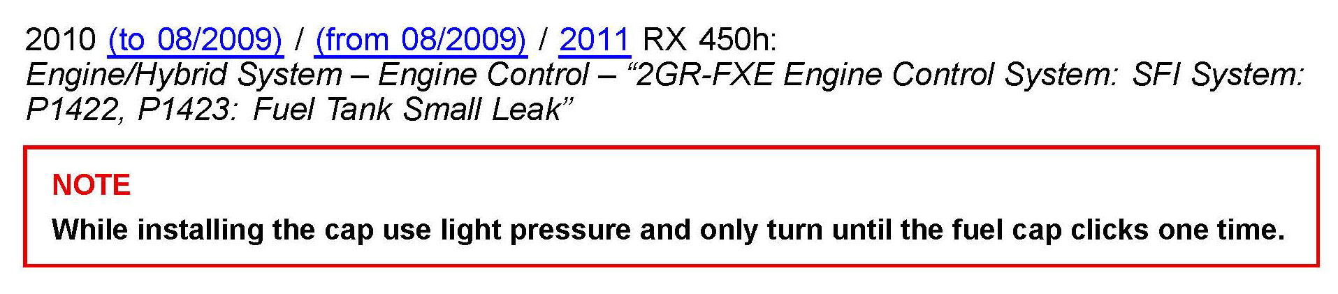 Some 2010 - 2011 model year RX 450h vehicles may exhibit a MIL "ON" condition with Diagnostic Trouble Code (DTC) P1423, or a fuel cap binding upon installation or removal. Use the following repair procedure to diagnose and address this condition.