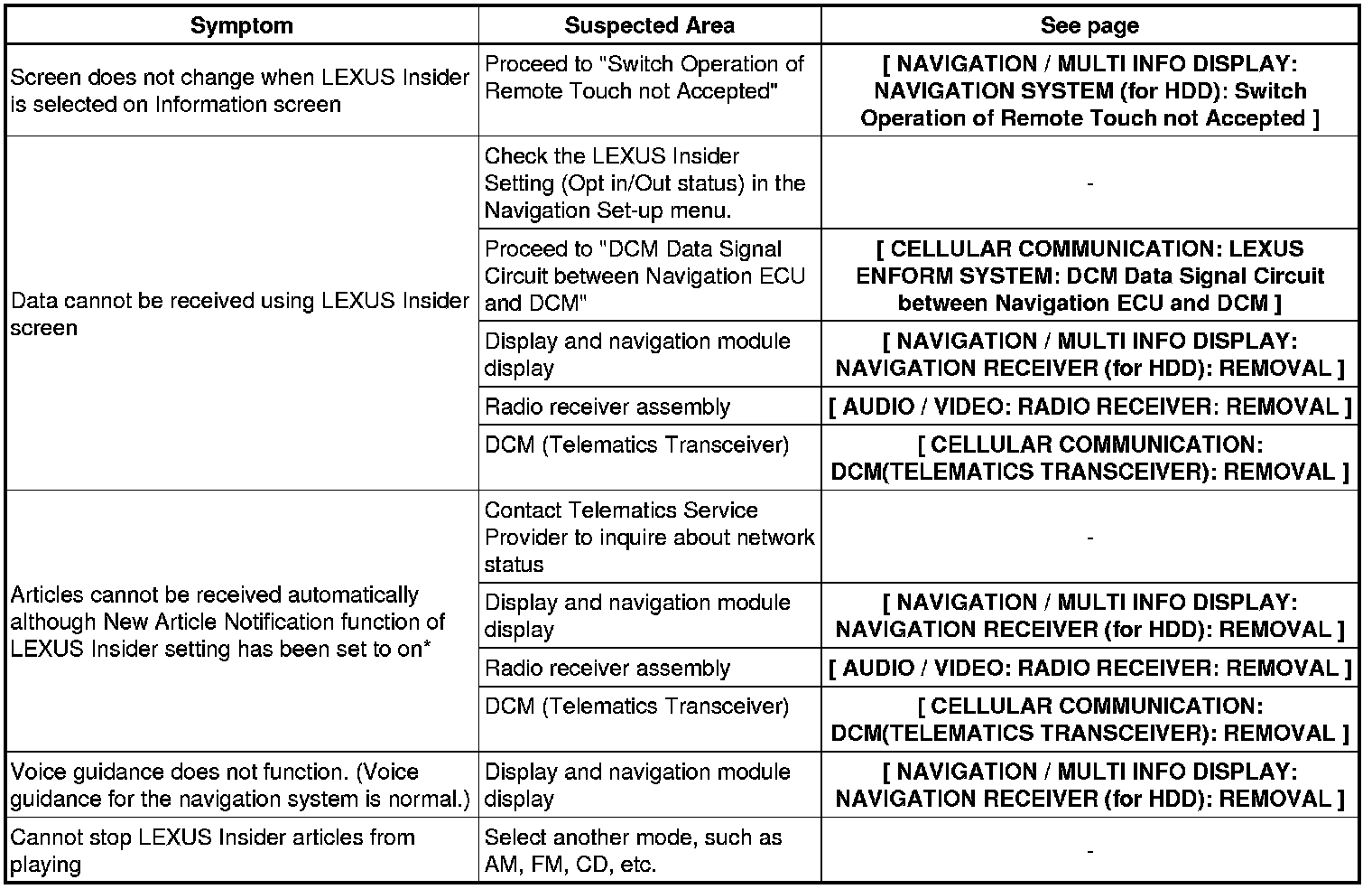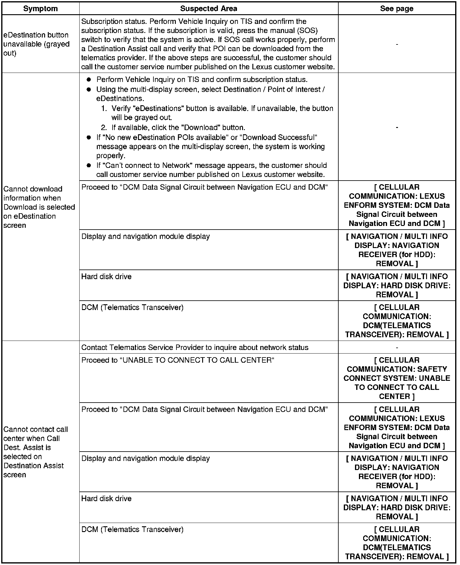 CELLULAR COMMUNICATION: LEXUS ENFORM SYSTEM: PROBLEM SYMPTOMS TABLE
