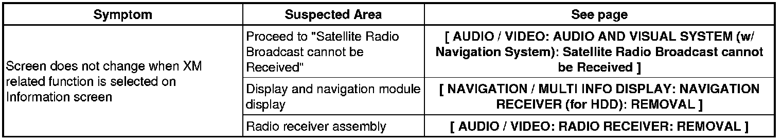 * Use the table below to help determine the cause of problem symptoms. If multiple suspected areas are listed, the potential causes of the symptoms are listed in order of probability in the "Suspected Area" column of the table. Check each symptom by checking the suspected areas in the order they are listed. Replace parts as necessary.