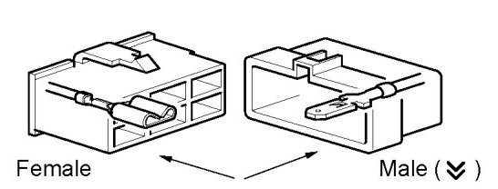Symbol (Down Arrows) indicates the male terminal connector. Numbers outside connector codes indicate the pin numbers of both male and female connectors.