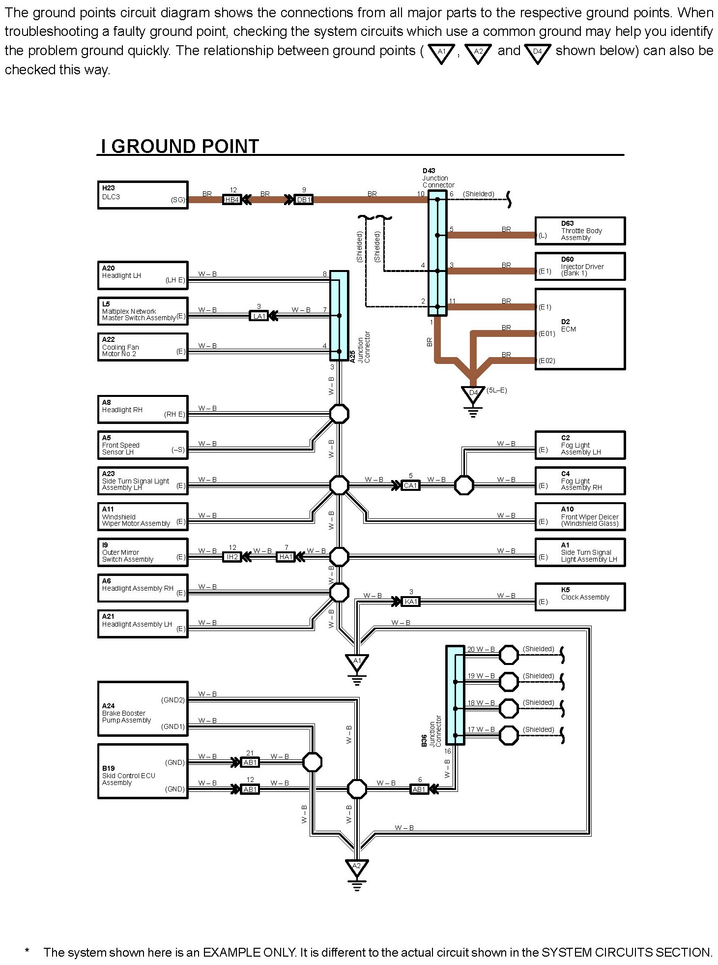 When the circuit operation is understood, begin troubleshooting of the problem circuit to isolate the cause. Use Relay Location and Electrical Wiring Routing sections to find each part, junction block and wiring harness connectors, wiring harness and wiring harness connectors and ground points of each system circuit. Internal wiring for each junction block is also provided for better understanding of connection within a junction block.