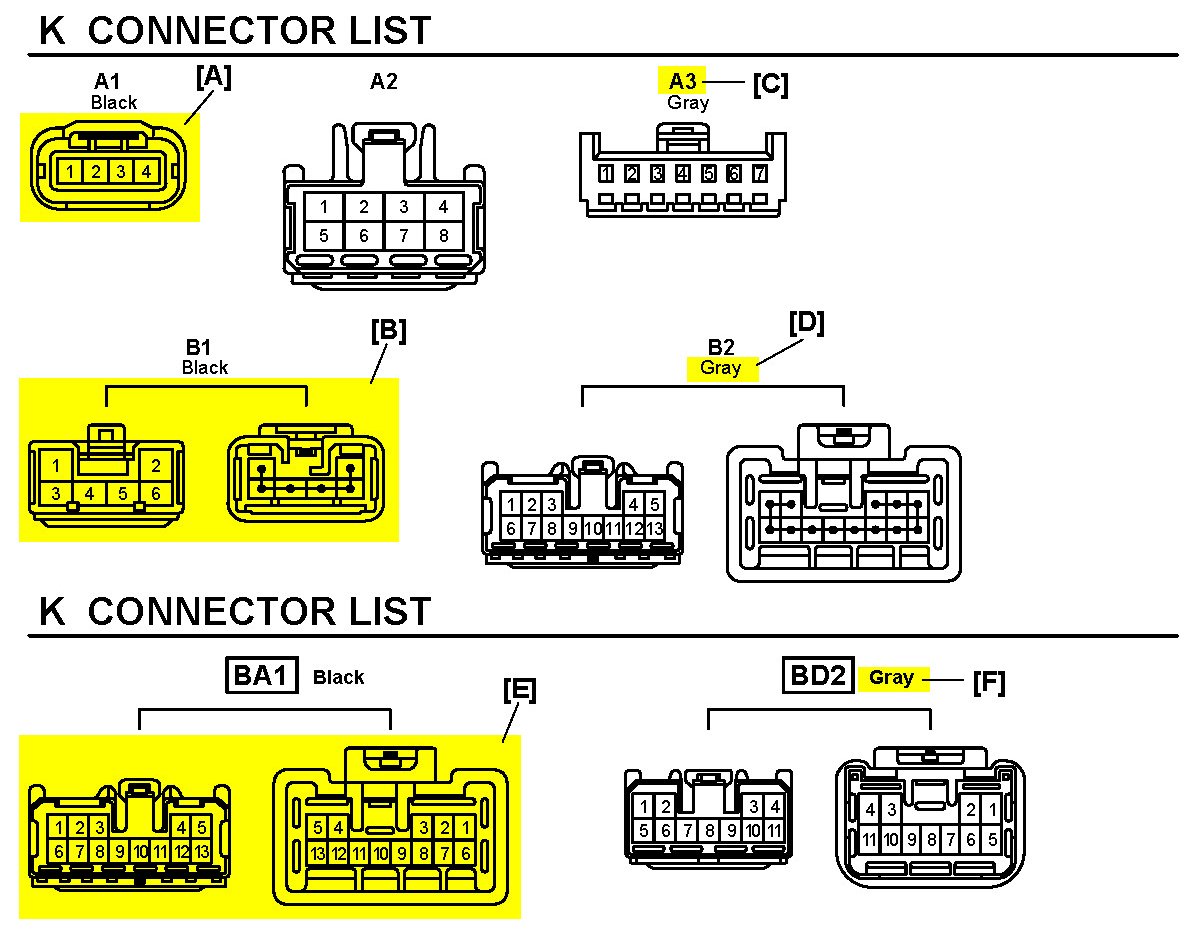 [E] : Indicates the code for the (male and female) connectors which are used to join two wire harnesses. The connector code consists of two alphabetical and one numerical characters.