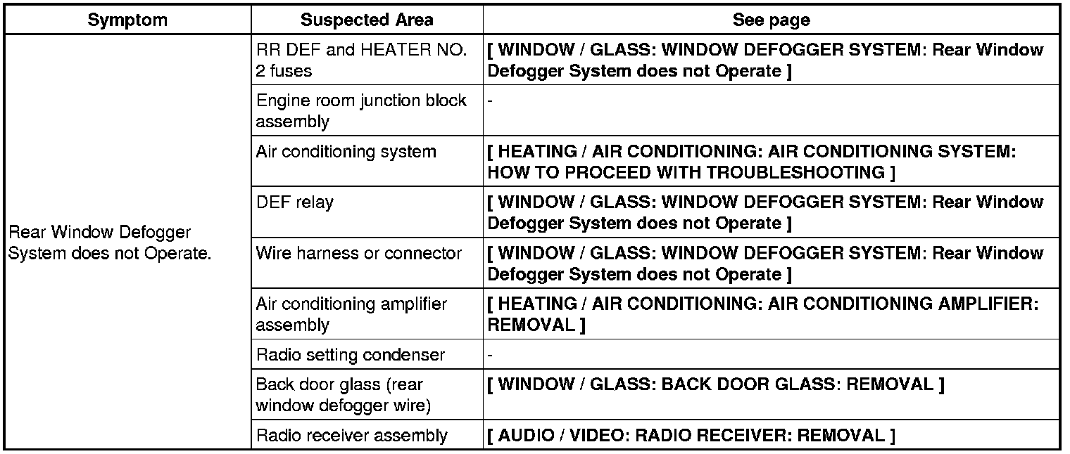 WINDOW / GLASS: WINDOW DEFOGGER SYSTEM: PROBLEM SYMPTOMS TABLE