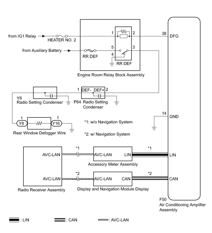 When the rear window defogger switch on the radio receiver assembly is pressed, the operation signal is transmitted to the air conditioning amplifier assembly through the AVC-LAN and LIN*1 or CAN*2 communication line. When the air conditioning amplifier assembly receives the signal, it turns on the RR DEF relay to operate the rear window defogger.
