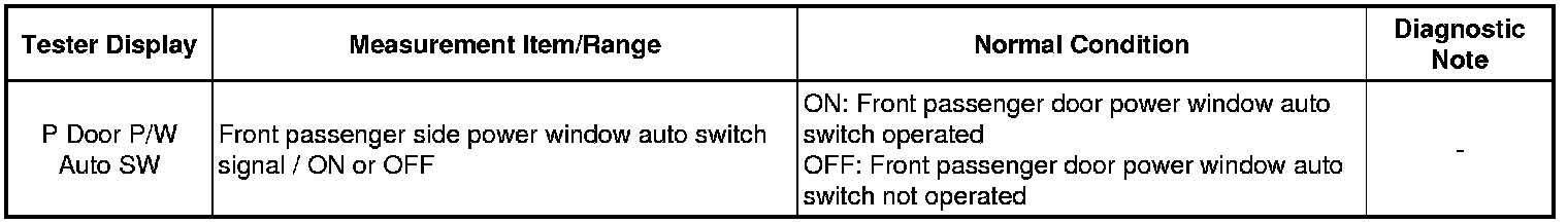 - Front Passenger Side Power Window Auto Up / Down Function does not Operate with Front Passenger Side Power Window Switch