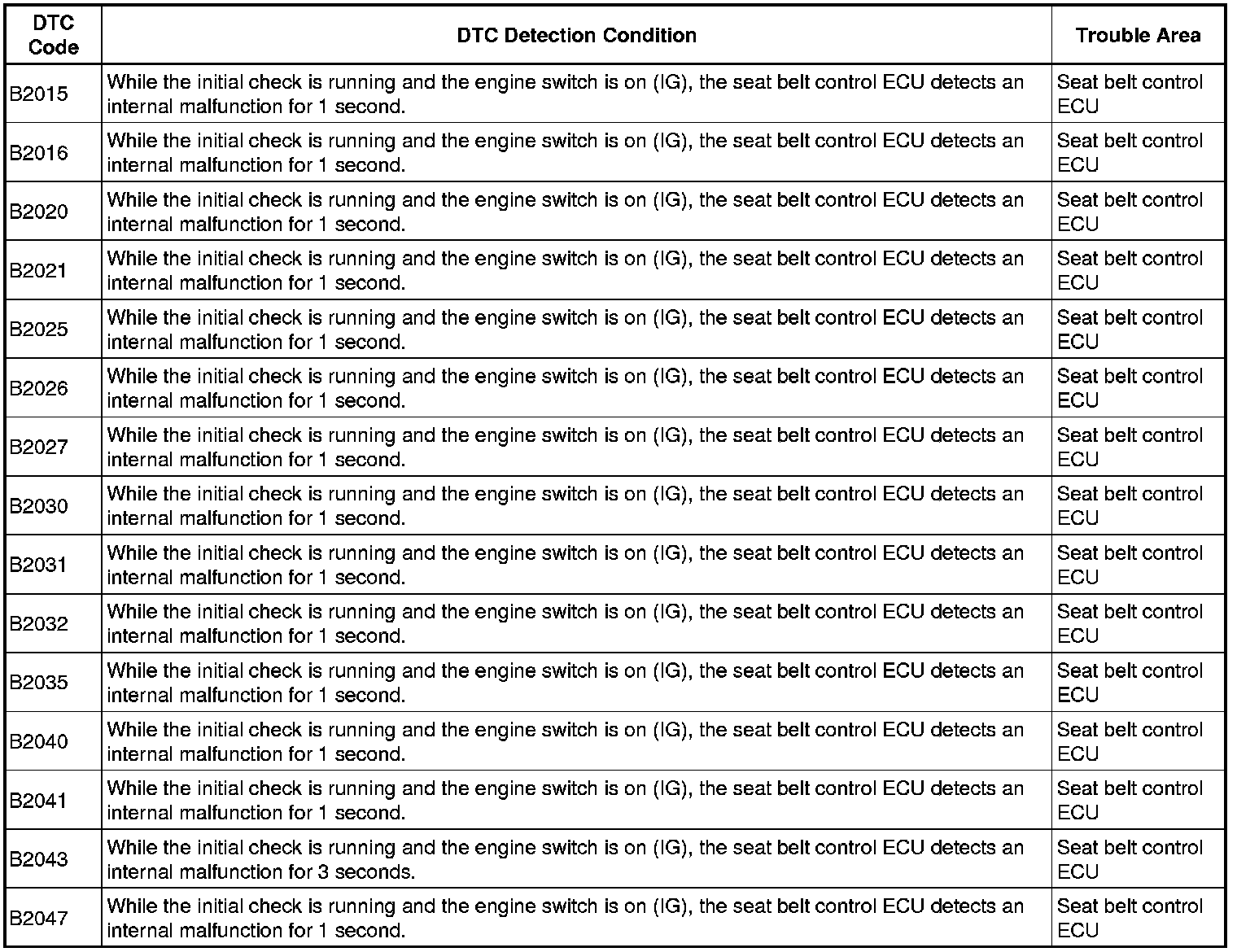 The DTCs above are output during the seat belt control ECU self-diagnosis.