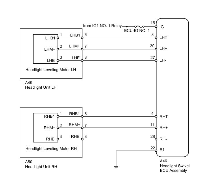 The headlight leveling motor operates by receiving the signal from the headlight swivel ECU. The headlight swivel ECU detects the headlight leveling motor status using the signal from the headlight leveling motor.