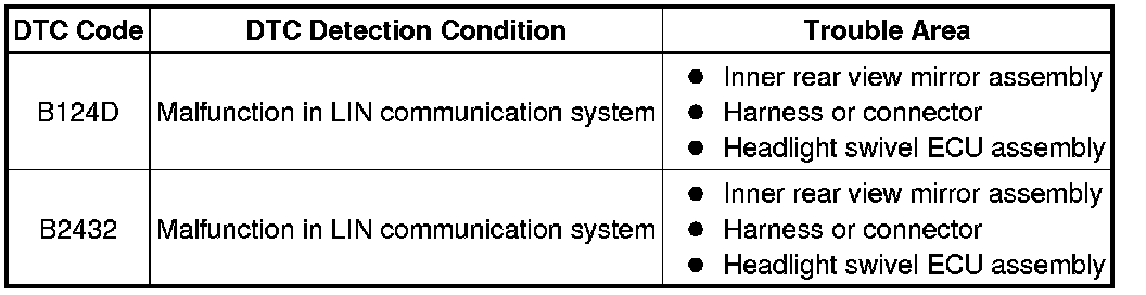 * DTC B2432 is stored when the headlight swivel ECU detects malfunctions in the LIN communication system.