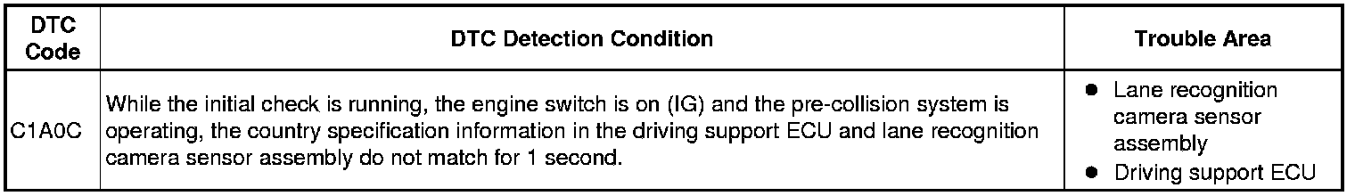 When the lane recognition camera sensor assembly is replaced with a new one, it acquires the country specification information from the driving support ECU. Also, when the driving support ECU is replaced with a new one, it receives country specification information from the main body ECU. When country specification information in the sensor and driving support ECU do not match, DTC C1A0C is output.