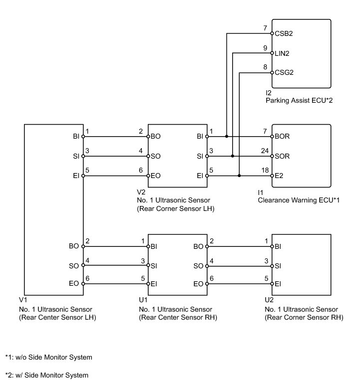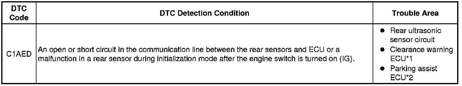 This DTC is stored when there is an open or short circuit in the communication line between the rear sensors and ECU, or when there is a malfunction in a rear sensor.