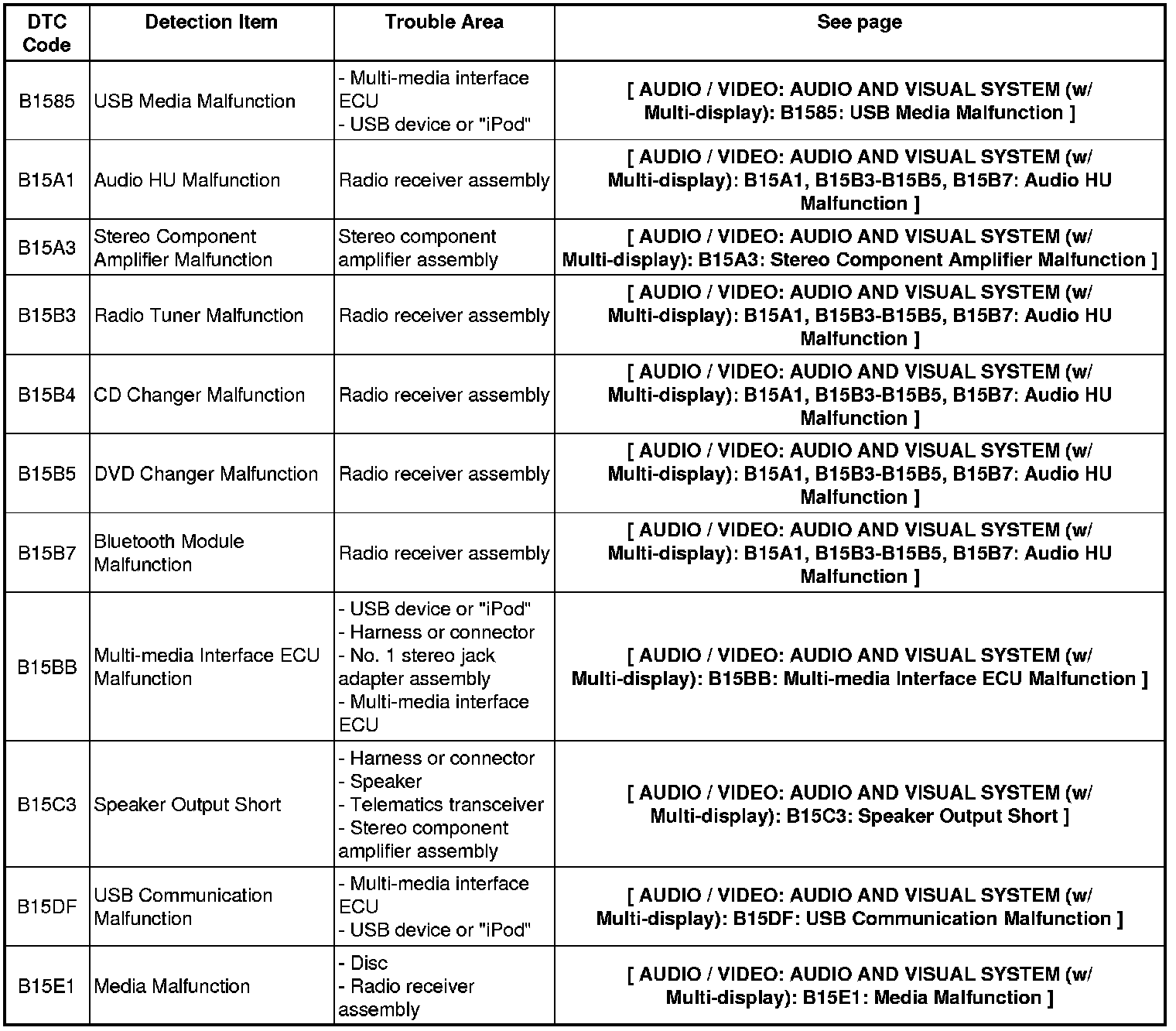 AUDIO / VIDEO: AUDIO AND VISUAL SYSTEM (w/ Multi-display): DIAGNOSTIC TROUBLE CODE CHART