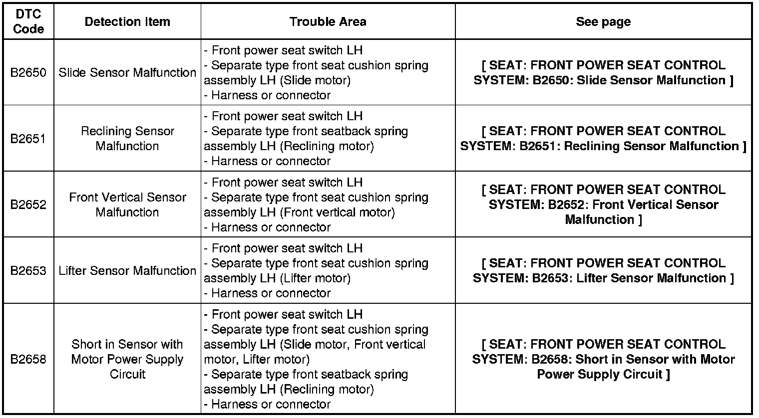 SEAT: FRONT POWER SEAT CONTROL SYSTEM: DIAGNOSTIC TROUBLE CODE CHART