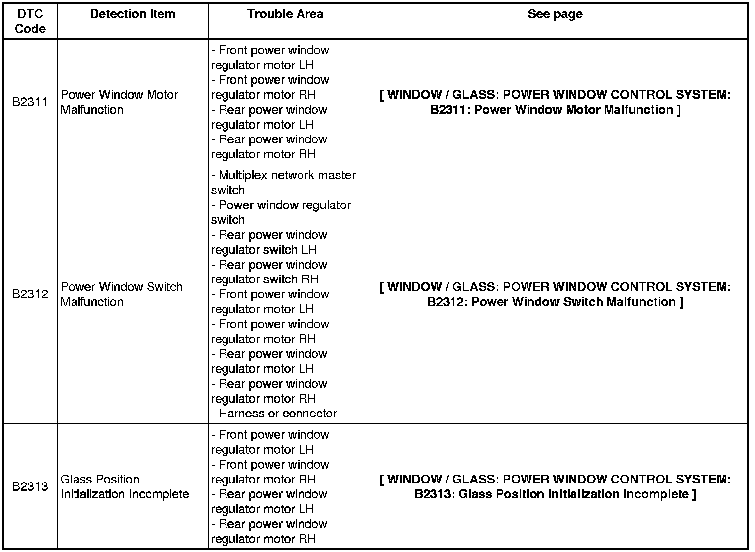 WINDOW / GLASS: POWER WINDOW CONTROL SYSTEM: DIAGNOSTIC TROUBLE CODE CHART