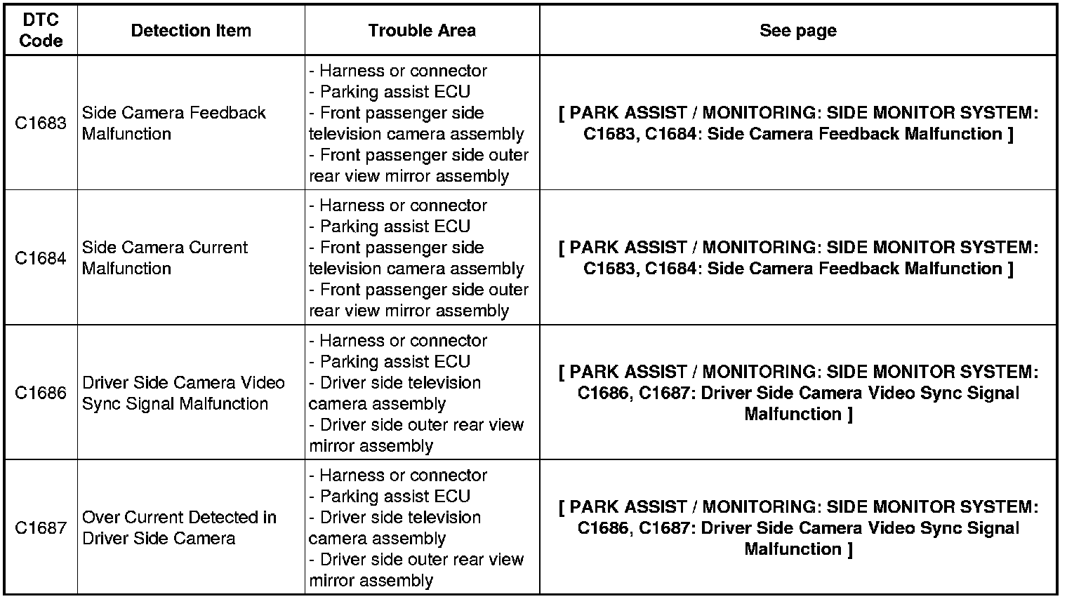 PARK ASSIST / MONITORING: SIDE MONITOR SYSTEM: DIAGNOSTIC TROUBLE CODE CHART