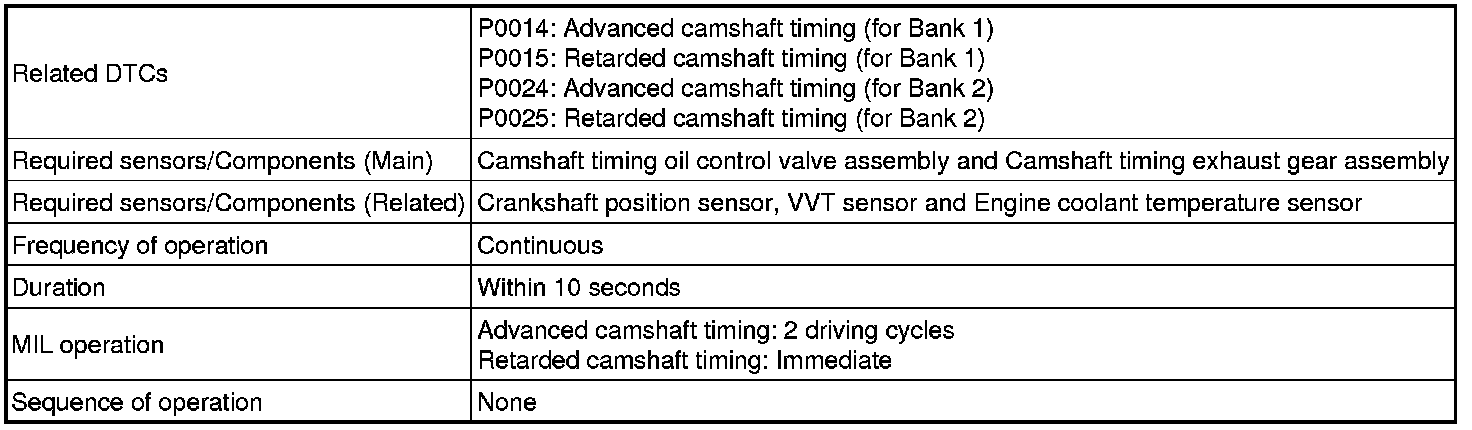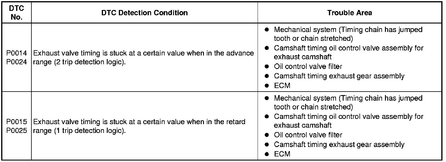 - If DTC P0014 or P0015 is output, check the bank 1 VVT system for the exhaust camshaft circuit.